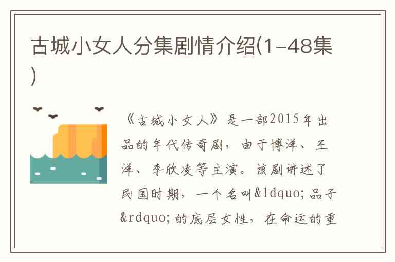请注意: 以上剧情介绍是基于该剧的故事梗概、人物设定和相关资料进行的梳理和重构,可能与实际播出的每一集细节存在些许出入。在缺乏官方逐集剧本的情况下,这份介绍旨在勾勒出《古城小女人》完整的叙事脉络和主人公的成长轨迹。