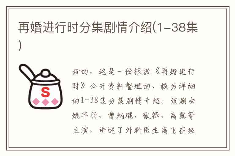 好的,这是一份根据《再婚进行时》公开资料整理的、较为详细的1-38集分集剧情介绍。该剧由姚芊羽、曹炳琨、张铎、高露等主演,讲述了外科医生高飞在经历婚姻失败后,如何面对生活、事业和情感,最终获得成长与幸福的故事。