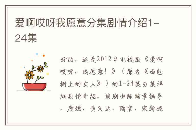 好的,这是2012年电视剧《爱啊哎呀,我愿意!》(原名《面包树上的女人》)的1-24集分集详细剧情介绍。该剧由陈铭章执导,唐嫣、黄义达、隋棠、宋新妮等人主演,讲述了三个好友程韵、沈光蕙、宋迪之在面对爱情与面包时的不同选择与成长。