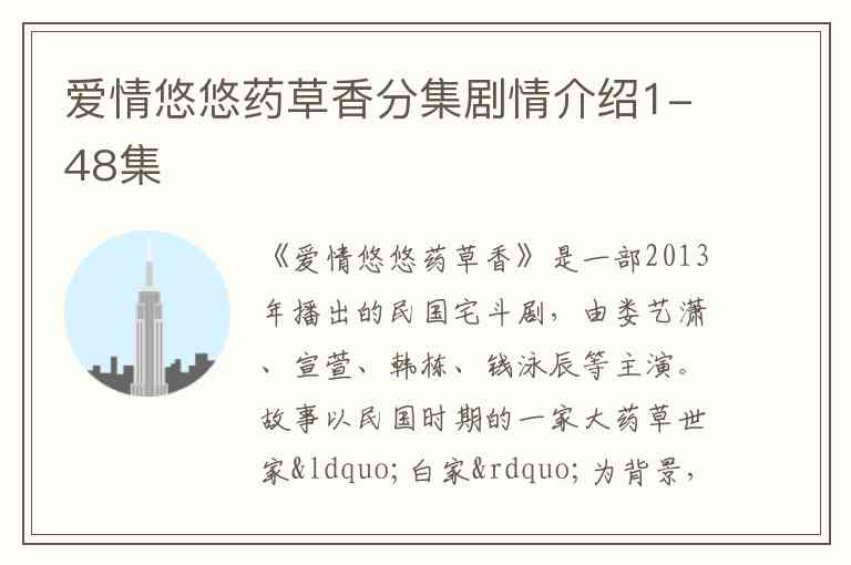 《爱情悠悠药草香》是一部2013年播出的民国宅斗剧,由娄艺潇、宣萱、韩栋、钱泳辰等主演。故事以民国时期的一家大药草世家“白家”为背景,讲述了家族内部妻妾之间的恩怨情仇、争权夺利的故事。