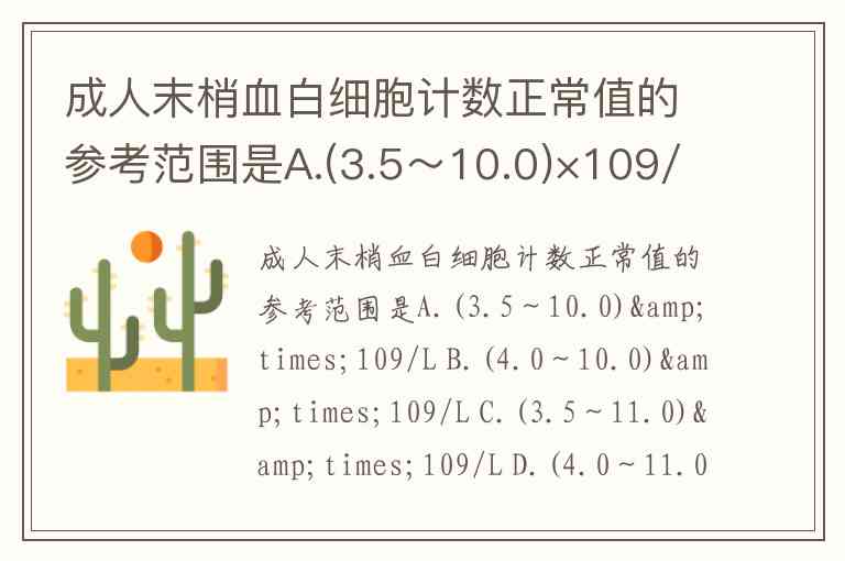 成人末梢血白细胞计数正常值的参考范围是A.(3.5~10.0)×109/L B.(4.0~10.0)×109/L C.(3.5~11.0)×109/L D.(4.0~11.0)×109/L E.(5.0~12.0)×109/L