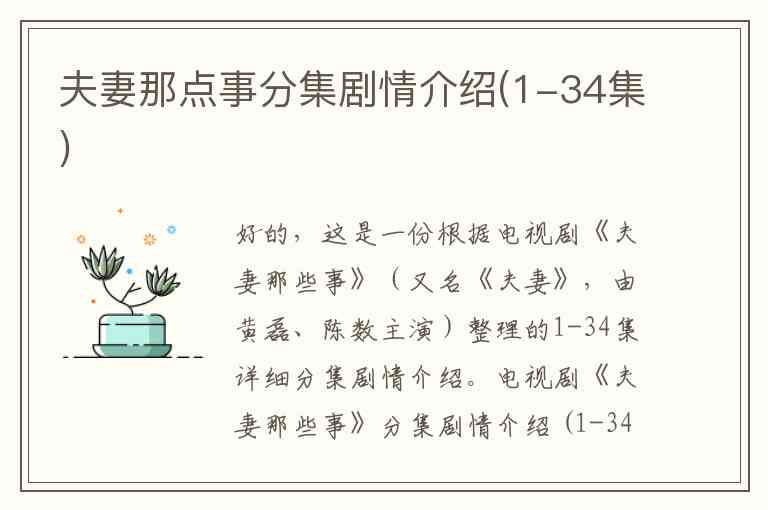 好的,这是一份根据电视剧《夫妻那些事》(又名《夫妻》,由黄磊、陈数主演)整理的1-34集详细分集剧情介绍。