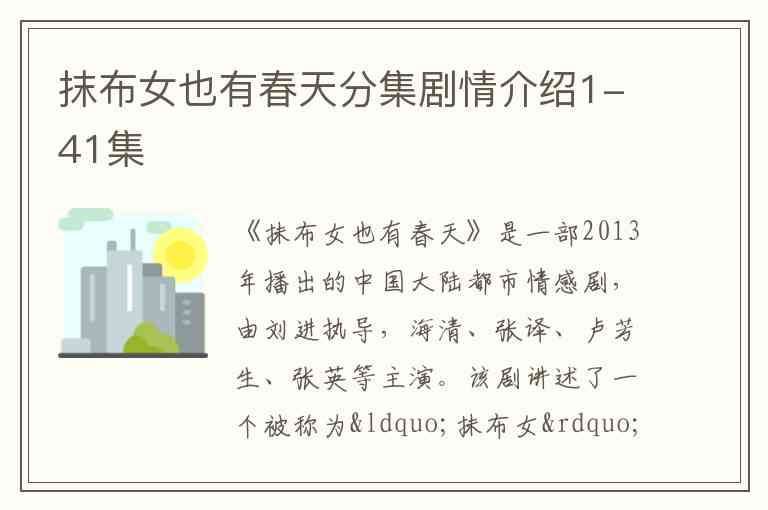 以上是《抹布女也有春天》第1-41集的详细分集剧情介绍。该剧通过罗小葱的成长故事,展现了一个普通女性在面对爱情、事业和家庭时的坚韧与智慧,传递了积极向上的人生态度。