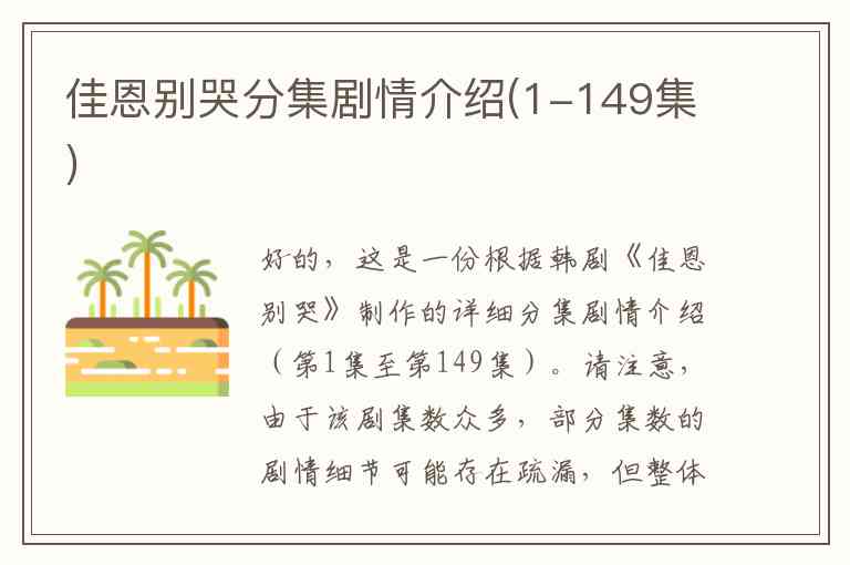 好的,这是一份根据韩剧《佳恩别哭》制作的详细分集剧情介绍(第1集至第149集)。请注意,由于该剧集数众多,部分集数的剧情细节可能存在疏漏,但整体故事脉络是完整和准确的。