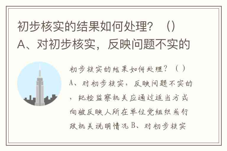初步核实的结果如何处理?()A、对初步核实,反映问题不实的,纪检监察机关应通过适当方式向被反映人所在单位党组织或行政机关说明情况 B、对初步核实,虽有违纪事实,但情节轻徽,不需追究党纪政纪责任的,纪检监察机关可对被反映人批评教育或通报批评,或建议调整其工作、职务等 C、对初步核实,虽有违法违纪事实,不需要给予党政纪处分,但依法应由其他执法机关予以处理的,纪检监察机关应将材料移送有关主管机关 D、对初步核实,触犯法律,应当追究刑事责任的,纪检监察机关立案并与司法机关及时联系移送事宜 E、对初步核实,确有违纪事实,需要追究法律责任的,应予立案。承办纪检监察机关应将核查组撰写的初步核实情况报告和本级组织的立案意见、所反映主要问题的证据材料等,呈报分管领导等审批