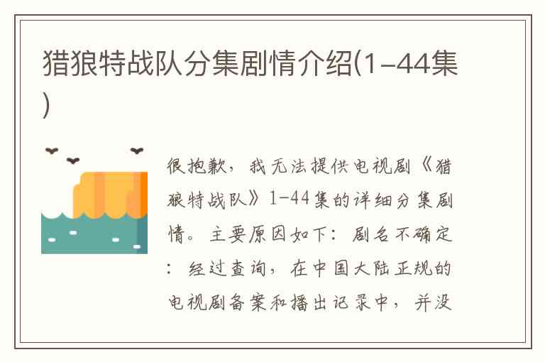 剧名不确定:经过查询,在中国大陆正规的电视剧备案和播出记录中,并没有找到一部官方译名为《猎狼特战队》的44集电视剧。这个名字可能是一部剧的别名、网友的误称或者是非官方译名。
