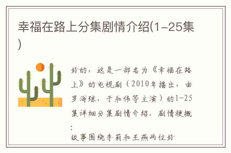 好的,这是一部名为《幸福在路上》的电视剧(2010年播出,由罗海琼、于和伟等主演)的1-25集详细分集剧情介绍。