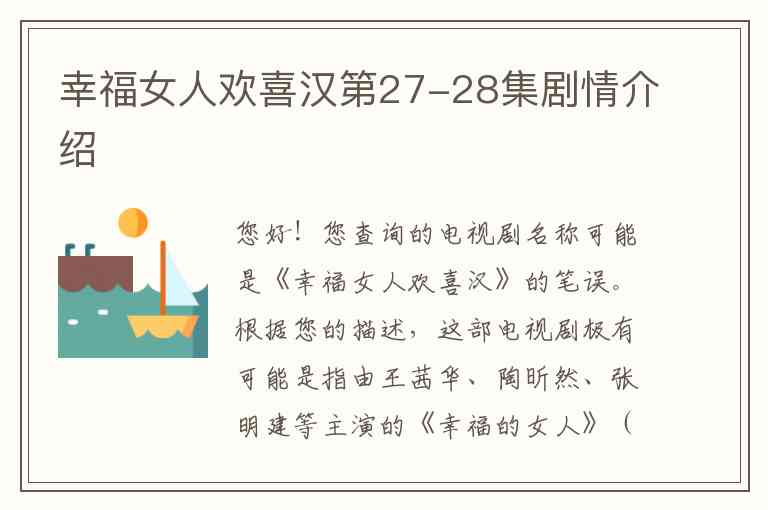 您好!您查询的电视剧名称可能是《幸福女人欢喜汉》的笔误。根据您的描述,这部电视剧极有可能是指由王茜华、陶昕然、张明建等主演的《幸福的女人》(也有其他译名)。