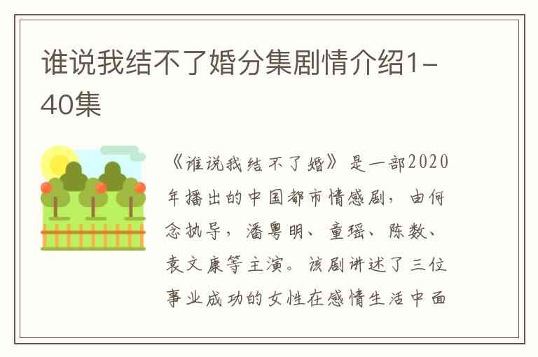 以上是《谁说我结不了婚》第1集至第40集的详细分集剧情介绍。该剧通过三位女性的故事,探讨了现代女性在事业、感情和婚姻中的选择与成长。