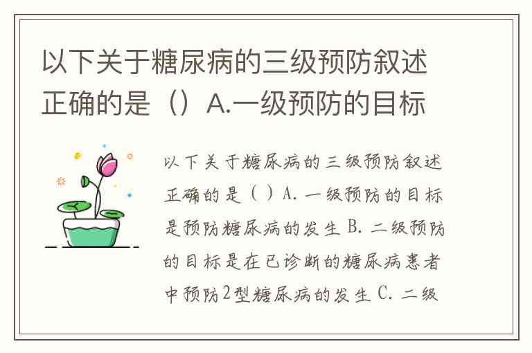 以下关于糖尿病的三级预防叙述正确的是()A.一级预防的目标是预防糖尿病的发生 B.二级预防的目标是在已诊断的糖尿病患者中预防2型糖尿病的发生 C.二级预防的目标是减少已发生的糖尿病并发症的进展降低致残率和死亡率,并改善患者的生存质量 D.三级预防的目标是减少已发生的糖尿病并发症的进展降低致残率和死亡率,并改善患者的生存质量 E.三级预防的目标是已诊断的2型糖尿病患者中预防糖尿病并发症的发生