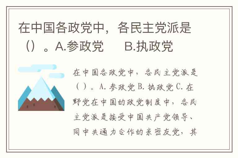在中国各政党中,各民主党派是()。A.参政党 B.执政党 C.在野党