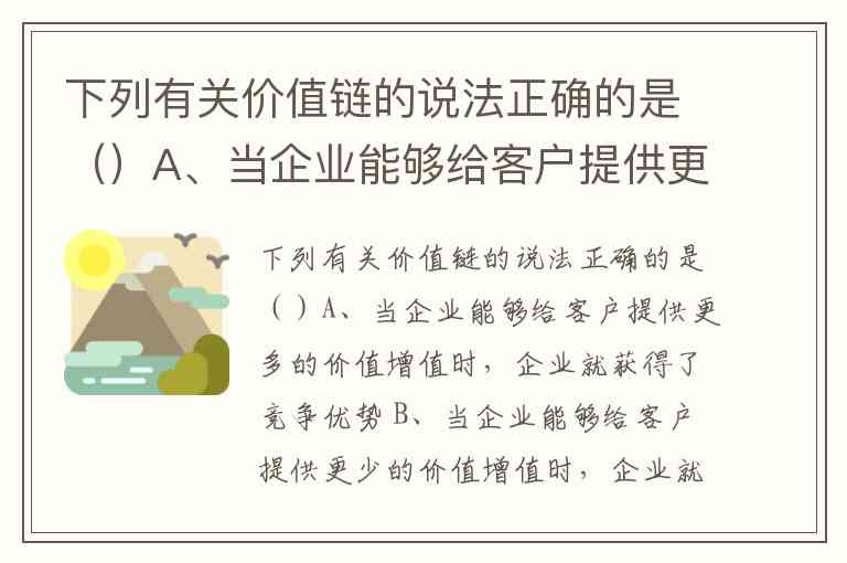 下列有关价值链的说法正确的是()A、当企业能够给客户提供更多的价值增值时,企业就获得了竞争优势 B、当企业能够给客户提供更少的价值增值时,企业就获得了竞争优势 C、当企业能够给以较高的成本提供相同的价值时,企业就获得了竞争优势 D、当企业能够给以较低的成本提供相同的价值时,企业没有获得竞争优势