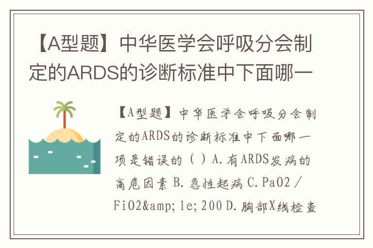 【A型题】中华医学会呼吸分会制定的ARDS的诊断标准中下面哪一项是错误的()A.有ARDS发病的高危因素 B.急性起病 C.PaO2/FiO2≤200 D.胸部X线检查两肺浸润阴影 E.PCWP≤16mmHg