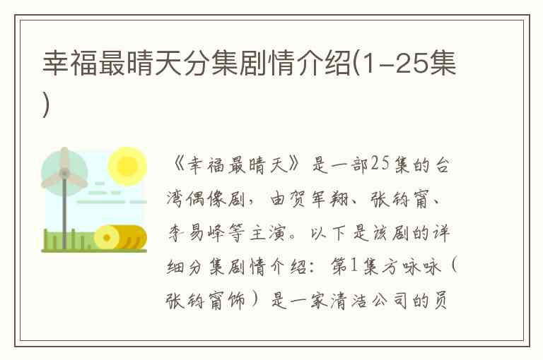 《幸福最晴天》是一部25集的台湾偶像剧,由贺军翔、张钧甯、李易峰等主演。以下是该剧的详细分集剧情介绍: