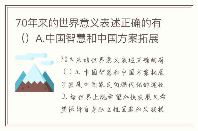 70年来的世界意义表述正确的有()A.中国智慧和中国方案拓展了发展中国家走向现代化的途径 B.给世界上既希望加快发展又希望保持自身独立性国家和民族提供全新选择 C.中国是迄今为止唯一经历了经济发展由盛至衰再至盛阶段 D.中国奇迹的创造与许多发达国家历史过程相比是在极短的时间里完成