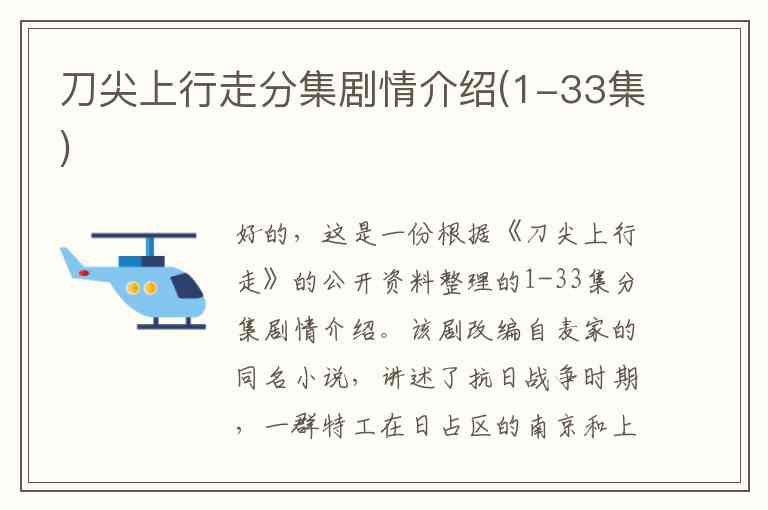 好的,这是一份根据《刀尖上行走》的公开资料整理的1-33集分集剧情介绍。该剧改编自麦家的同名小说,讲述了抗日战争时期,一群特工在日占区的南京和上海,于刀尖之上周旋、斗争与牺牲的故事。