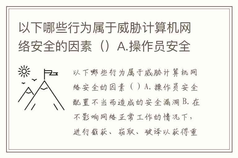 以下哪些行为属于威胁计算机网络安全的因素()A.操作员安全配置不当而造成的安全漏洞 B.在不影响网络正常工作的情况下,进行截获、窃取、破译以获得重要机密信息 C.安装非正版软件 D.以上均是