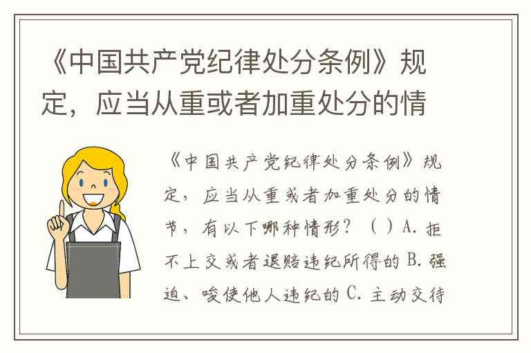 《中国共产党纪律处分条例》规定,应当从重或者加重处分的情节,有以下哪种情形?()A.拒不上交或者退赔违纪所得的 B.强迫、唆使他人违纪的 C.主动交待本人应当受到党纪处分的问题的 D.违纪受处分后又因故意违纪应当受到党纪处分的