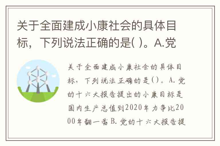 关于全面建成小康社会的具体目标,下列说法正确的是( )。A.党的十六大报告提出的小康目标是国内生产总值到2020年力争比2000年翻一番 B.党的十六大报告提出的小康目标是国内生产总值到2020年力争比2000年翻两番 C.党的十七大报告指出,要实现人均国内生产总值到2020年比2000年翻两番 D.党的十八大报告强调,要实现国内生产总值和城乡居民人均收入比2010年翻一番