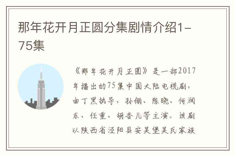 《那年花开月正圆》是一部2017年播出的75集中国大陆电视剧,由丁黑执导,孙俪、陈晓、何润东、任重、胡杏儿等主演。该剧以陕西省泾阳县安吴堡吴氏家族的史实为背景,讲述了清末民间女商人周莹(孙俪 饰)从江湖少女成长为秦商女首富的传奇故事。