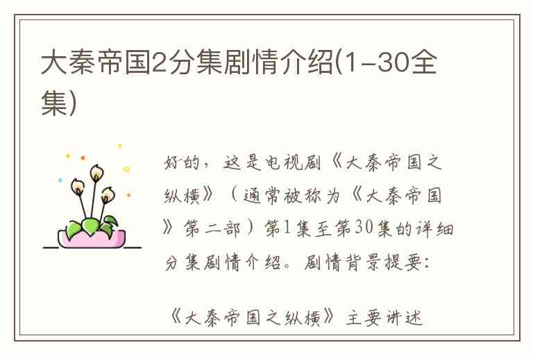 好的,这是电视剧《大秦帝国之纵横》(通常被称为《大秦帝国》第二部)第1集至第30集的详细分集剧情介绍。