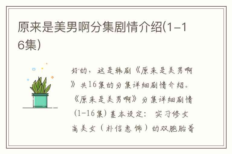 好的,这是韩剧《原来是美男啊》共16集的分集详细剧情介绍。