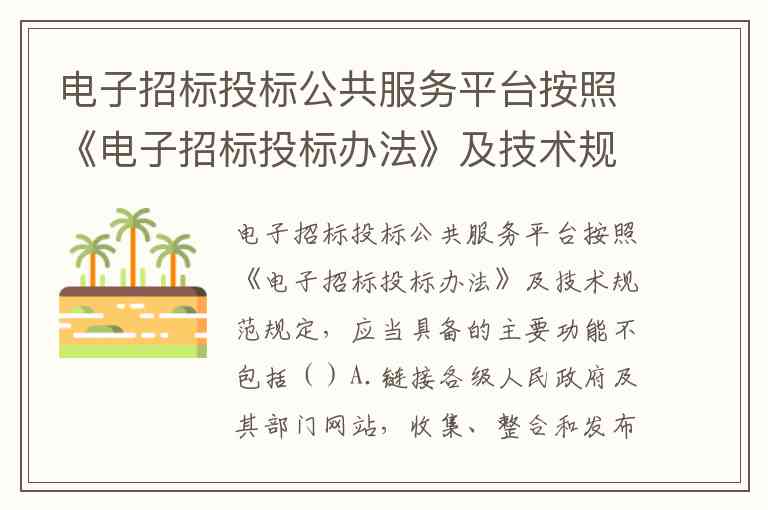 电子招标投标公共服务平台按照《电子招标投标办法》及技术规范规定,应当具备的主要功能不包括()A.链接各级人民政府及其部门网站,收集、整合和发布有关法律法规规章及规范性文件、行政许可、行政处理决定、市场监管和服务的相关信息; B.支持不同电子认证服务机构数字证书的兼容互认; C.依法设立电子招标投标评标专家库,实现专家资源共享; D.整合分析相关数据信息,动态反映招标投标市场运行状况、相关市场主体业绩和信用情况。