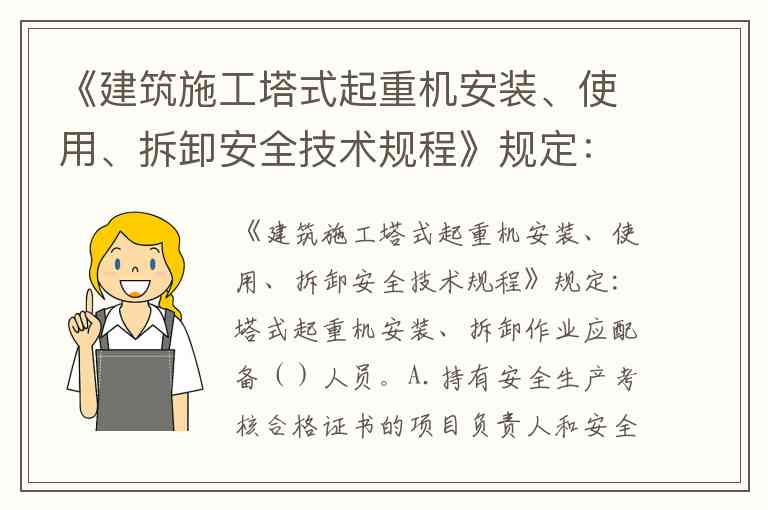 综上,正确答案为ABCD。这一人员配置体系体现了“管理+技术”双重保障机制,是塔式起重机安拆作业安全的核心制度设计。实际操作中,所有人员需确保证书在有效期内,并严格遵守专项施工方案要求,方能启动作业。
