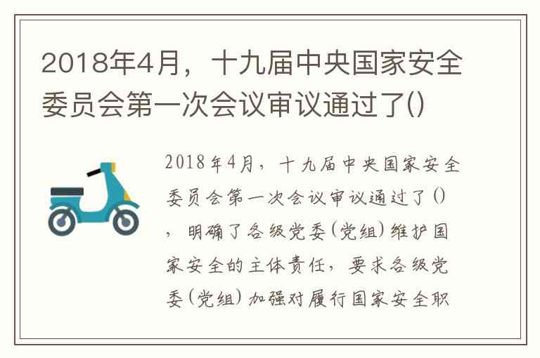 2018年4月,十九届中央国家安全委员会第一次会议审议通过的文件是《党委(党组)国家安全责任制规定》,该文件明确了各级党委(党组)维护国家安全的主体责任,并要求加强对履行国家安全职责的督促检查,以确保党中央关于国家安全工作的决策部署落到实处。这一规定的出台是党对国家安全工作绝对领导的制度体现,也是推进国家安全体系现代化的重要举措。