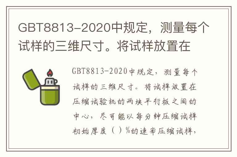 GBT8813-2020中规定,测量每个试样的三维尺寸。将试样放置在压缩试验机的两块平行板之间的中心,尽可能以每分钟压缩试样初始厚度()%的速率压缩试样,直至测得压缩强度σm和/或10%相对形变时的压缩应力σ10。A.1 B.5 C.10 D.15