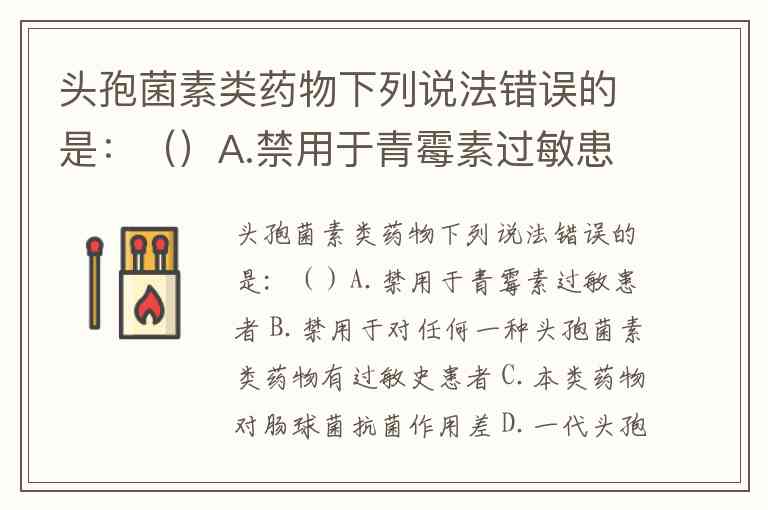 头孢菌素类药物下列说法错误的是:()A.禁用于青霉素过敏患者 B.禁用于对任何一种头孢菌素类药物有过敏史患者 C.本类药物对肠球菌抗菌作用差 D.一代头孢菌素与氨基糖苷类药物合用可加重后者肾毒性