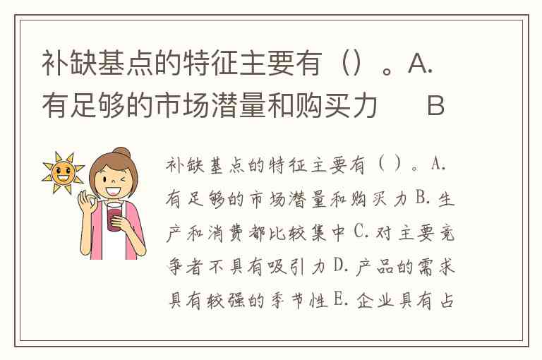 补缺基点的特征主要有()。A.有足够的市场潜量和购买力 B.生产和消费都比较集中 C.对主要竞争者不具有吸引力 D.产品的需求具有较强的季节性 E.企业具有占据该补缺基点所必需的资源和能力