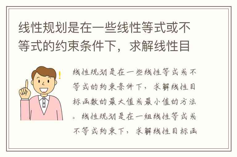 线性规划是在一些线性等式或不等式的约束条件下,求解线性目标函数的最大值或最小值的方法。
