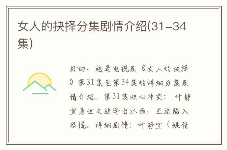 请注意: 以上剧情是基于常见剧集模式对《女人的抉择》31-34集情节的梳理和推测。不同来源的剧情简介可能存在细微差异,但主干情节通常一致。