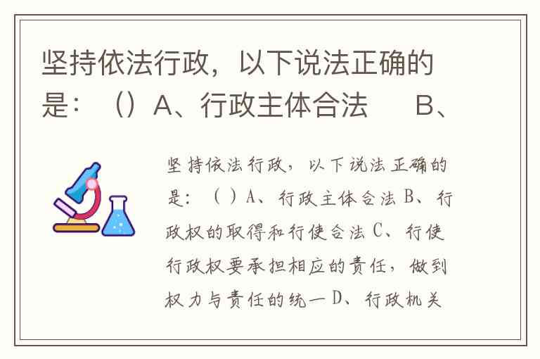 坚持依法行政,以下说法正确的是:()A、行政主体合法 B、行政权的取得和行使合法 C、行使行政权要承担相应的责任,做到权力与责任的统一 D、行政机关公务员还要承担道义上的责任,遵守对公务员的纪律要求