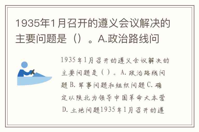 1935年1月召开的遵义会议解决的主要问题是()。A.政治路线问题 B.军事问题和组织问题 C.确定以陕北为领导中国革命大本营 D.土地问题
