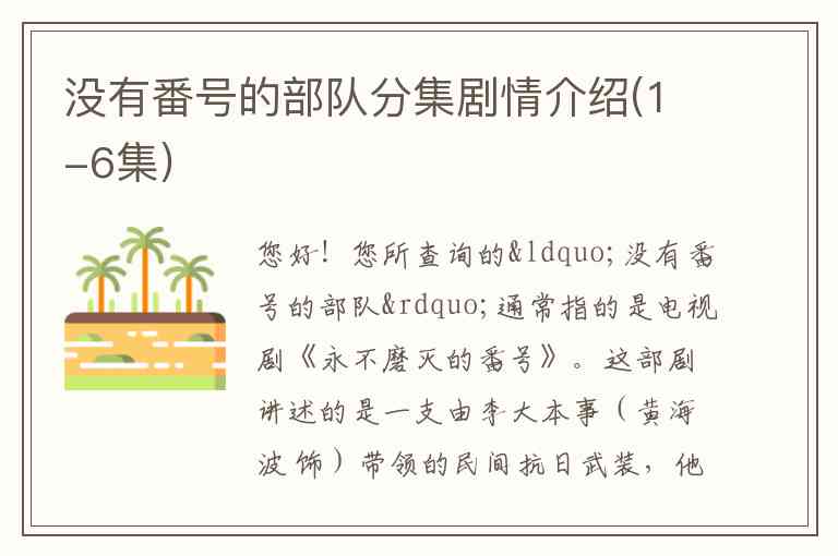 您好!您所查询的“没有番号的部队”通常指的是电视剧《永不磨灭的番号》。这部剧讲述的是一支由李大本事(黄海波 饰)带领的民间抗日武装,他们自发组织、英勇作战,却因没有正规编制而被称作“没有番号的部队”。