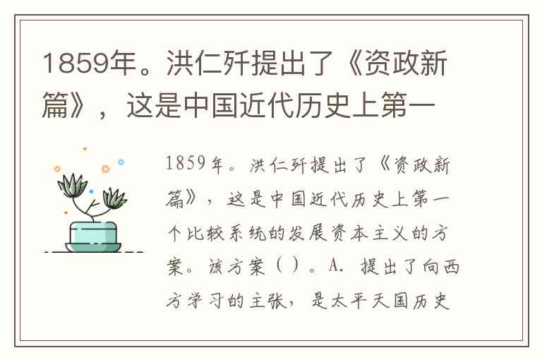 C选项错误,该方案未涉及土地问题,也非农民战争实践的产物。洪仁玕基于香港见闻提出主张,其内容"与太平天国农民战争没有任何渊源",无法反映农民迫切的土地要求。相较而言,前期的《天朝田亩制度》才是基于土地分配的农民革命纲领,而《资政新篇》更多体现知识分子的改良构想。