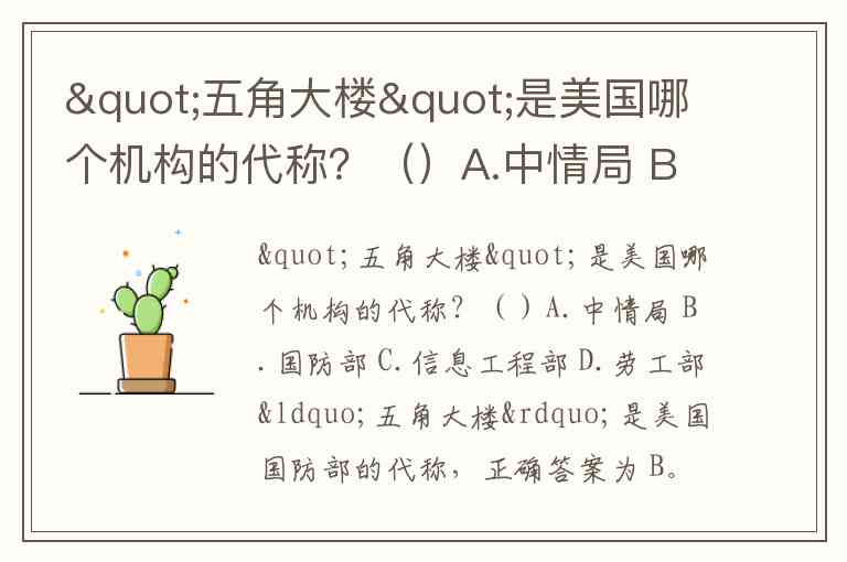 其他选项中,A. 中情局(中央情报局)是独立情报机构,总部位于弗吉尼亚州兰利;C. 信息工程部并非美国联邦政府核心部门;D. 劳工部则负责就业、劳工权益等民生事务,三者均与“五角大楼”无关联。这一常识性问题在各类试题中也被多次验证,反映了建筑名称与机构职能的紧密对应关系。
