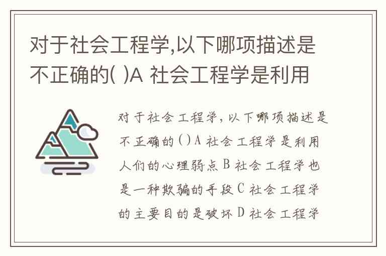 对于社会工程学,以下哪项描述是不正确的( )A 社会工程学是利用人们的心理弱点 B 社会工程学也是一种欺骗的手段 C 社会工程学的主要目的是破坏 D 社会工程学是对人的研究