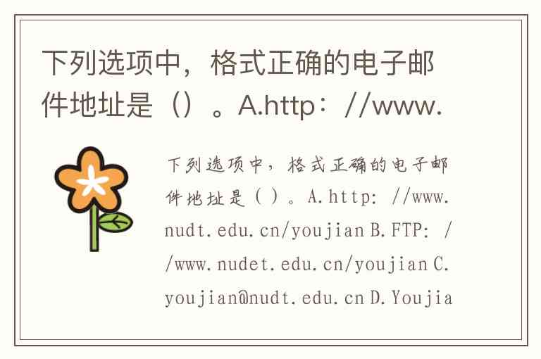 下列选项中,格式正确的电子邮件地址是()。A.http://www.nudt.edu.cn/youjian B.FTP://www.nudet.edu.cn/youjian C.youjian@nudt.edu.cn D.Youjian#nudt.edu.cn