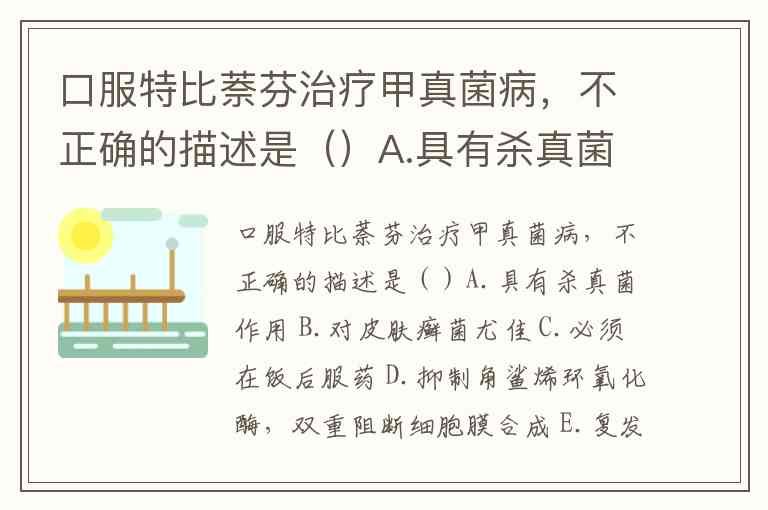 口服特比萘芬治疗甲真菌病,不正确的描述是()A.具有杀真菌作用 B.对皮肤癣菌尤佳 C.必须在饭后服药 D.抑制角鲨烯环氧化酶,双重阻断细胞膜合成 E.复发率低