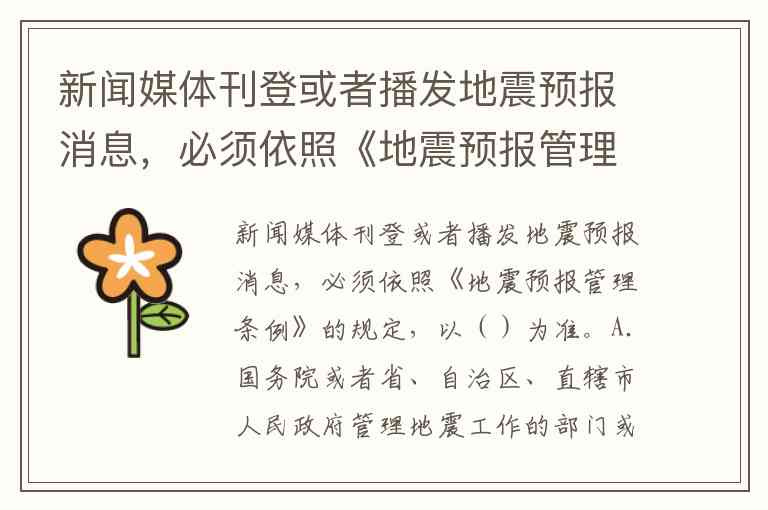 新闻媒体刊登或者播发地震预报消息,必须依照《地震预报管理条例》的规定,以()为准。A.国务院或者省、自治区、直辖市人民政府管理地震工作的部门或者机构发布的地震预报 B.县级以上地方人民政府管理地震工作的部门或者机构发布的地震预报 C.国务院或者省、自治区、直辖市人民政府发布的地震预报 D.县级以上地方人民政府发布的地震预报
