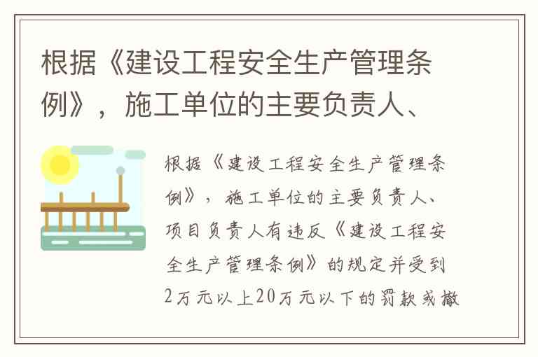 根据《建设工程安全生产管理条例》第六十六条规定,施工单位的主要负责人、项目负责人因未履行安全生产管理职责受到2万元以上20万元以下罚款或撤职处分的,自刑罚执行完毕或受处分之日起,5年内不得担任任何施工单位的主要负责人、项目负责人。这一规定旨在通过职业限制强化安全生产责任追究,防止安全管理失职人员短期内重返关键岗位。