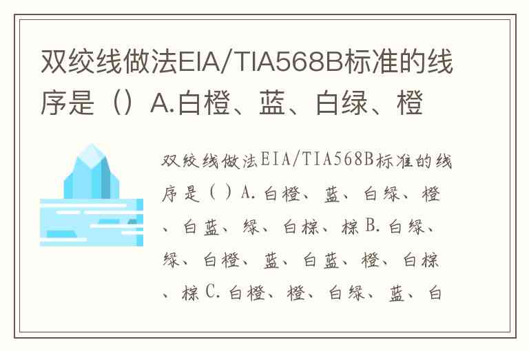 双绞线做法EIA/TIA568B标准的线序是()A.白橙、蓝、白绿、橙、白蓝、绿、白棕、棕 B.白绿、绿、白橙、蓝、白蓝、橙、白棕、棕 C.白橙、橙、白绿、蓝、白蓝、绿、白棕、棕 D.白绿、绿、白橙、蓝、白蓝、白棕、橙、棕