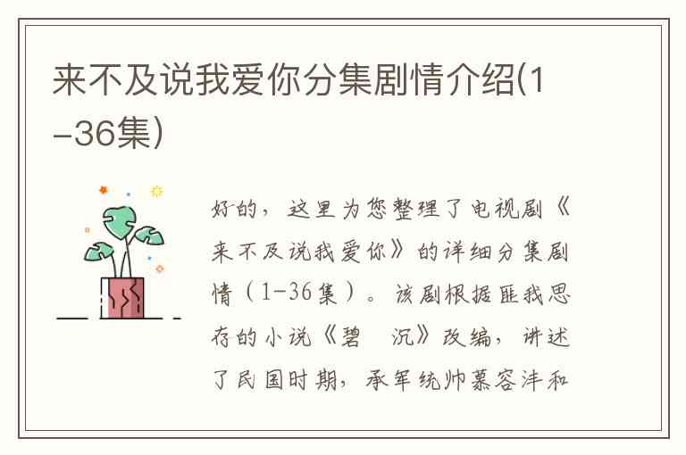 好的,这里为您整理了电视剧《来不及说我爱你》的详细分集剧情(1-36集)。该剧根据匪我思存的小说《碧甃沉》改编,讲述了民国时期,承军统帅慕容沣和富商之女尹静琬之间跌宕起伏的爱情故事。