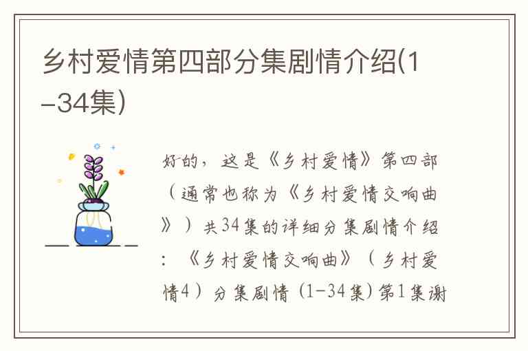 好的,这是《乡村爱情》第四部(通常也称为《乡村爱情交响曲》)共34集的详细分集剧情介绍: