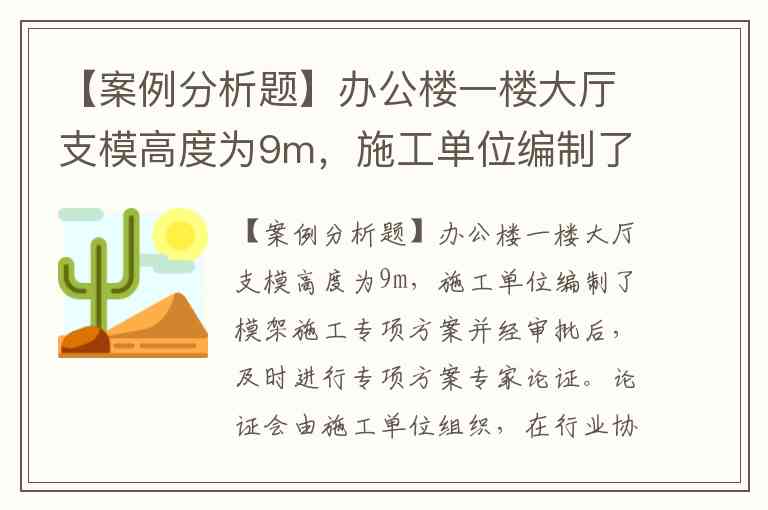 关键混淆点:规范中将模板工程分为两个层级——搭设高度5m及以上或总荷载10kN/m²及以上属于"危险性较大工程",仅需编制专项方案;而本题问的"需要专家论证"对应更高风险等级,需满足搭设高度8m/跨度18m/总荷载15kN/m²/集中线荷载20kN/m²中任一条件。案例中9m高度符合论证要求,但题目考核的是通用条件而非具体案例判定。