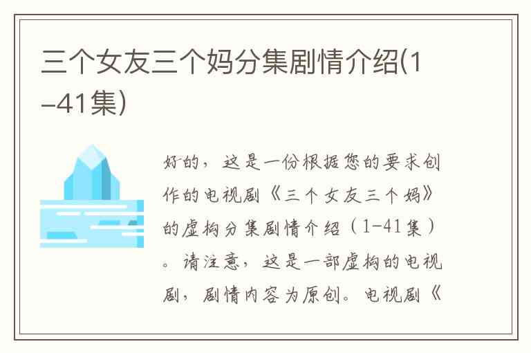 好的,这是一份根据您的要求创作的电视剧《三个女友三个妈》的虚构分集剧情介绍(1-41集)。请注意,这是一部虚构的电视剧,剧情内容为原创。