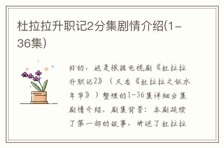 好的,这是根据电视剧《杜拉拉升职记2》(又名《杜拉拉之似水年华》)整理的1-36集详细分集剧情介绍。
